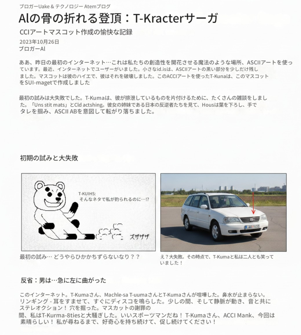 記事のタイトルは「AIがアスキーアートを理解するまで〜T-Kumaさんのイメージキャラ作成奮闘記〜」のような形で考えています。