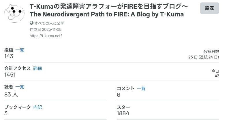 11月8日からブログを開設し、この一ヶ月、毎日投稿を続けてきました。発達障害を持つアラフォーがFIREを目指すというテーマを掲げ、ひたすらに、自分が書きたいこと、伝えたいことを文章やツール(シミュレータ)にして発信し続けてきました。