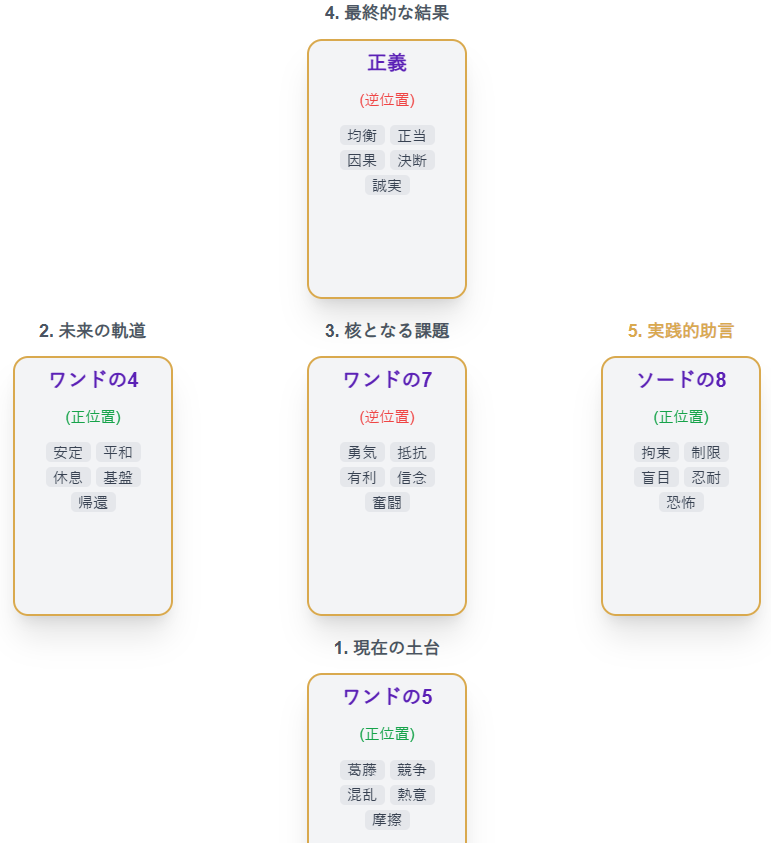 今回の占いで、私が最も気になったカードは、最終結果に出た正義(逆位置)でした。