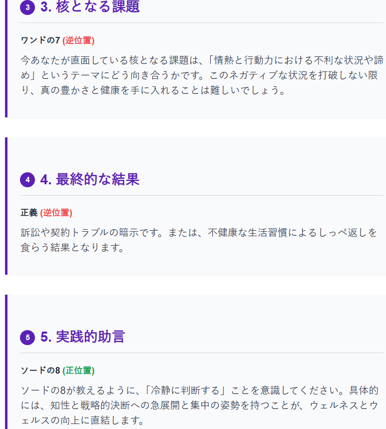 使用した占いサイトは、健康と金運に特化した「T-Kuma自作のタロットシミュレータ」です。